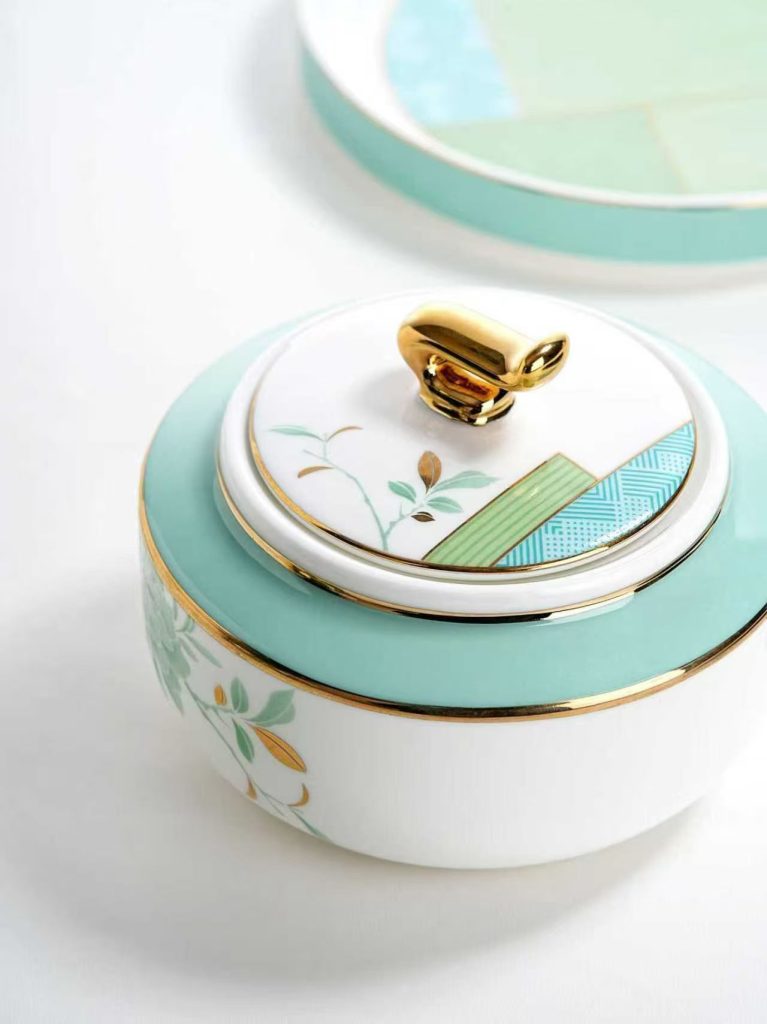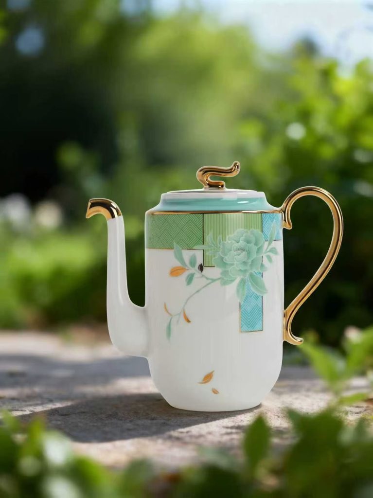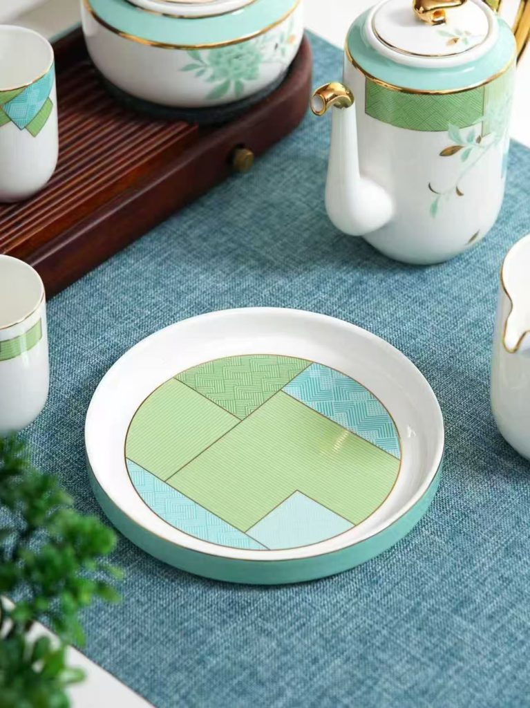 灵感撷取东方园林的窗棂花影与初春新叶。浅绿枝叶婉转舒展,蓝青几何纹样错落其间,勾勒出如烟似雾的朦胧诗意。手绘鎏金线条,如阳光穿过林隙,在瓷器边缘流淌出一道道静谧的光。一壶、一杯、一碟,皆是一幅可品可饮的写意小品。
